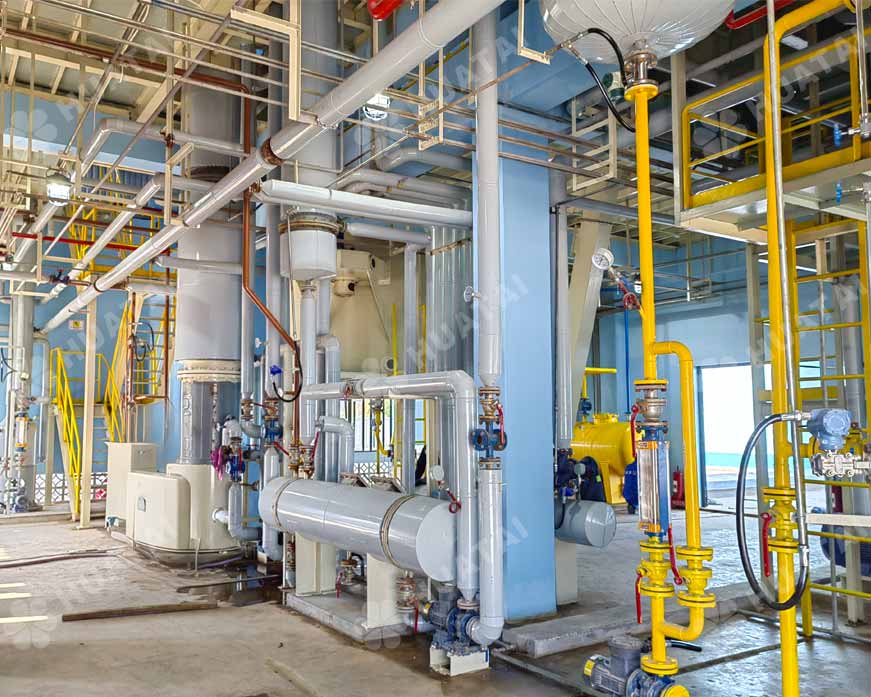 In some cases when processing dewaxed oil, de-waxing process is also included in rice bran oil refinery plant. Steam distillation is the last step of edible rice bran oil factory machine. The purpose is to remove any off flavors and residual free fatty acids. In middle-large rice bran oil factory, rice bran oil refining plant is built to improve the quality of final oil.